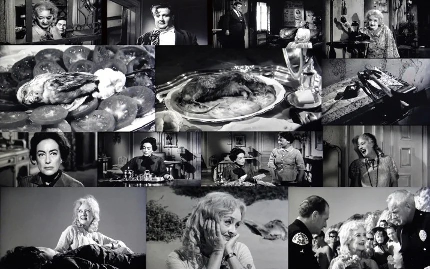 Film realizzato sull’omonimo romanzo di Henry Farrell, prodotto e diretto da Robert Aldrich nel 1962. Narra la storia di due sorelle Hudson, che sin da fanciulle si esibiscono in teatro, per poi nel tempo, cadere nell’oblio. Il film è suddiviso in tre parti con datazione: 1917, 1935, 1962. Nel film le due protagoniste sono interpretate da due grandi dive, Bette Davis (“Baby” Jean Hudson) e Joan Crawford (Blance Hudson).