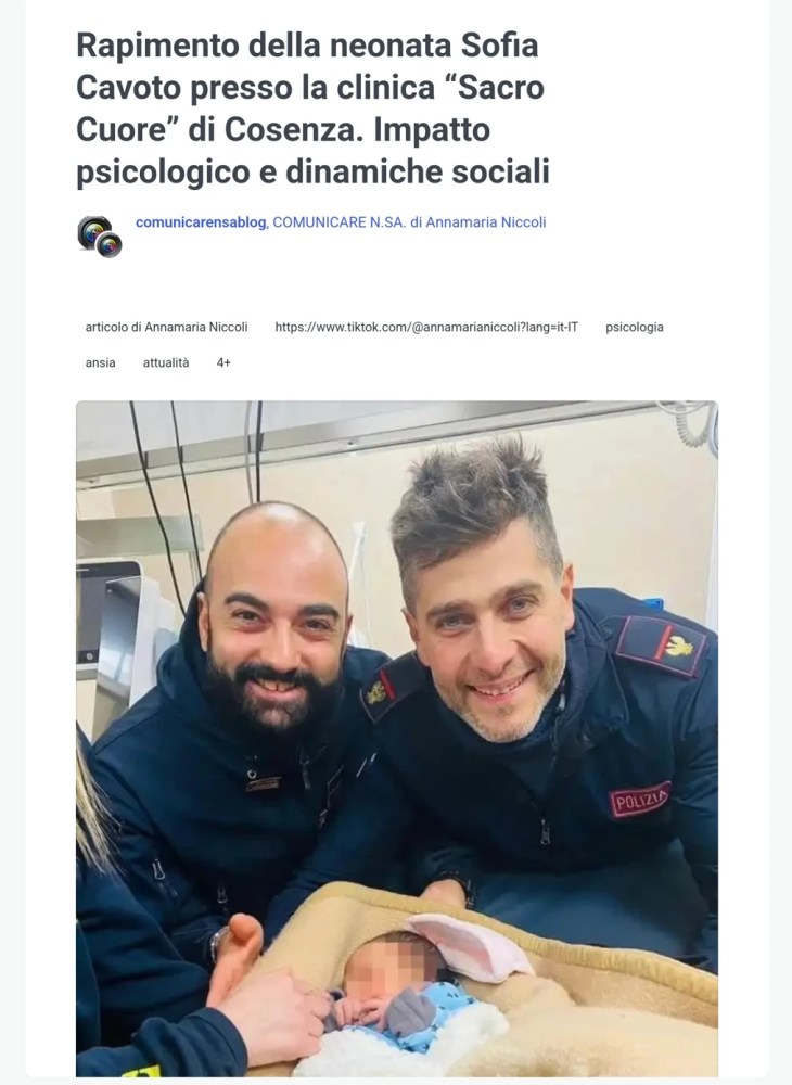 Le implicazioni psicologiche del rapimento sulla rapitrice, identificata come Rosa Vespa, sono profondamente intrecciate con la sua salute mentale e le relazioni familiari. Le azioni di Vespa, che includevano la simulazione di una gravidanza per nove mesi e l’orchestrazione di un parto fittizio, indicano una profonda disconnessione dalla realtà e una potenziale storia di trauma. Il suo comportamento estremo può essere interpretato come un meccanismo di difesa, forse derivante da un dolore irrisolto o da un senso di vuoto esistenziale. Questa frattura psicologica potrebbe averla portata a costruire un’elaborata illusione di maternità, consentendole di sfuggire momentaneamente alla sua realtà. La meticolosa pianificazione del rapimento, inclusa una riunione celebrativa con i parenti e l’acquisto di articoli per neonati, rivela una coerenza inquietante nella sua narrazione, suggerendo che potrebbe aver creato un meccanismo di difesa mentale per far fronte ai suoi desideri insoddisfatti. Inoltre, le dinamiche all’interno della sua famiglia sono cruciali per comprendere le sue azioni; se suo marito era veramente ignaro del suo inganno, ciò indica una significativa disconnessione relazionale. Il disagio emotivo e psicologico sperimentato dai genitori di Sofia Cavoto è un aspetto centrale di questo tragico evento. Il rapimento ha infranto il loro senso di sicurezza all’interno di un ambiente clinico, che è tipicamente associato alla sicurezza e alla cura. Il trauma della perdita, unito alla vulnerabilità che deriva da tale violazione, può avere effetti duraturi sul loro benessere mentale. Le conseguenze immediate del rapimento hanno probabilmente comportato intensi sentimenti di panico, disperazione e una devastante consapevolezza dei rischi associati alla genitorialità. La ricerca indica che i genitori che sperimentano la perdita o il rapimento di un figlio spesso affrontano sfide psicologiche prolungate, tra cui sintomi di disturbo da stress post-traumatico (PTSD), ansia. Il sacro legame tra madre e figlio, che dovrebbe essere coltivato in un luogo di guarigione, è stato violentemente interrotto, lasciando cicatrici emotive che potrebbero non guarire mai del tutto. Questo incidente non solo solleva interrogativi sulla sicurezza personale, ma evidenzia anche le più ampie implicazioni sociali di tali esperienze traumatiche. La risposta sociale al rapimento di Sofia Cavoto racchiude una complessa interazione tra la rappresentazione mediatica e la mobilitazione della comunità. Lo shock iniziale e l’orrore espressi dalle reazioni speculari del pubblico osservate in altri casi di rapimento di minori di alto profilo, in cui i media svolgono un ruolo fondamentale nel plasmare la percezione della sicurezza. La copertura sensazionalistica del rapimento non solo ha accresciuto i timori pubblici sulla sicurezza dei bambini, ma ha anche amplificato l’urgenza di misure preventive all’interno delle comunità. Le narrazioni dei media spesso si concentrano sull’atto criminale in sé piuttosto che sui problemi di salute mentale sottostanti affrontati dal colpevole, il che può portare a una comprensione distorta di tali eventi. La rappresentazione del rapitore tende a mettere in ombra le lotte personali che potrebbero averla spinta a commettere un atto così estremo, perpetuando un ciclo di paura e incomprensione. Da apprezzare la mobilitazione della comunità cosentina in seguito al rapimento, caratterizzata da una rapida risposta delle forze dell’ordine e da un’ondata di sostegno pubblico per la famiglia, illustra un desiderio collettivo di sicurezza e rassicurazione. Questo evento ha catalizzato un maggiore senso di vigilanza all’interno della comunità, spingendo le famiglie ad adottare misure di protezione per i propri figli.