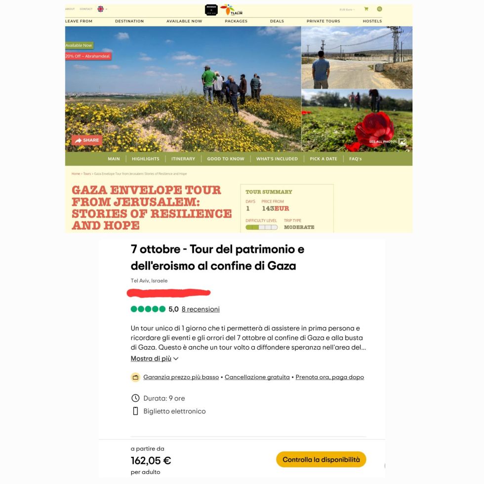 Vengono condotte escursioni con guide nei luoghi in cui si sono svolti gli eventi organizzati da Amas il 7 ottobre 2023. Si tratta di escursioni giornaliere prenotabili online, che offrono ai partecipanti la possibilità di visitare aree della Striscia di Gaza settentrionale e punti panoramici da cui osservare le zone colpite dalla guerra; i partecipanti considerati “più fortunati” hanno inoltre la possibilità di ascoltare in prima persona gli effetti sonori dei bombardamenti e di vedere gli effetti visivi sotto forma di lampi e fumo che sale dalle rovine. Si svolgono anche escursioni sulle alture del Golan, dove i partecipanti possono visitare le basi militari israeliane e guardare oltre il confine, verso la Siria.