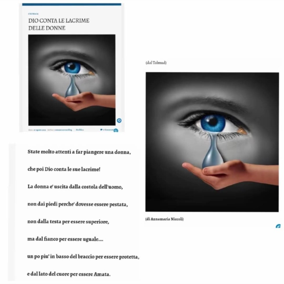 Questa frase, tratta dal “Talmud”, uno dei testi sacri la cui validità e il cui impatto risultano profondamente sentiti nella tradizione ebraica, è un appello agli uomini a rivalutare l’importanza di non far piangere una donna. È un appello quest’esposto in modo più ricorrente, che sottolinea l’esigenza d’un profondo stimato in funzione del delicato sentimento d’attenzione a cura rivolta a tutto il sesso femminile.