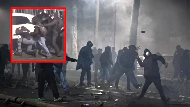 L’immagine che resterà impressa nella memoria collettiva, e che ora è al vaglio della DIGOS, è un video di pochi secondi che sembra girato in una zona di guerra. Un agente del Reparto Mobile, nel pieno di una manovra di contenimento, rimane isolato. In un istante, il “vuoto” tattico si riempie di odio: venti, forse trenta persone, volti coperti e sguardi fissi, lo accerchiano. Non è una carica, è un assedio.